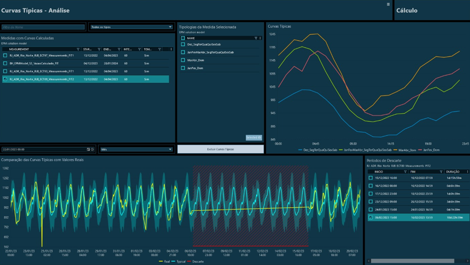 O módulo de curvas típicas do Elipse Water identifica o comportamento típico de medidas amostradas, de acordo com o seu histórico e considerando a sazonalidade e o tipo de dia. A correlação dessas medidas com o modelo físico da rede e o histórico das variáveis permite gerar alarmes automáticos de possíveis vazamentos ou grandes perdas de água, auxiliando o operador a tomar decisões mais rápidas e eficazes.