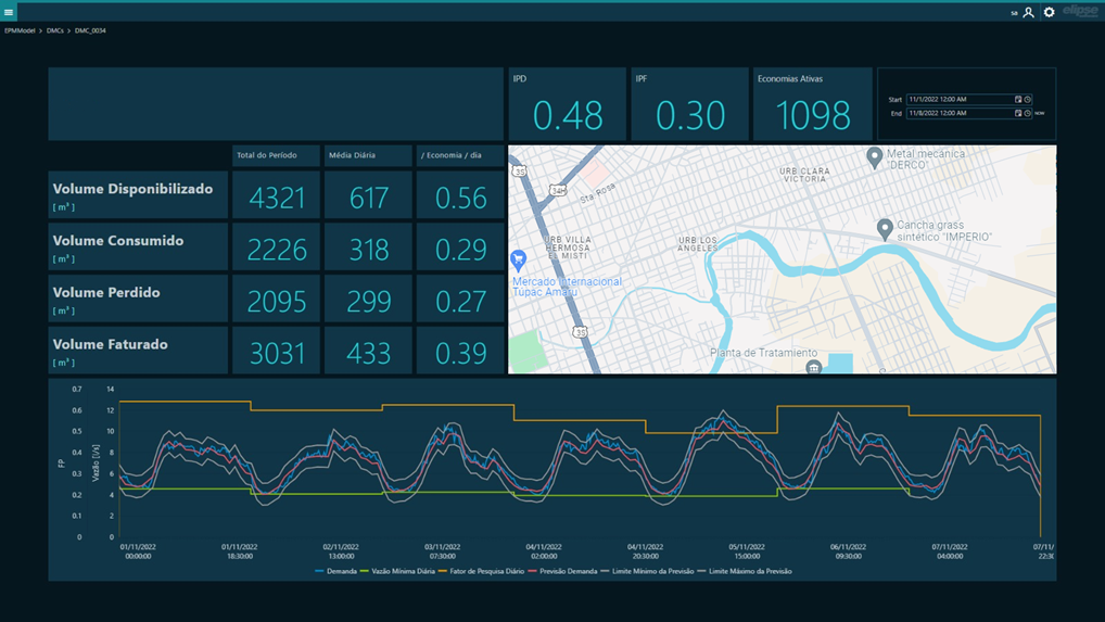 Outro módulo disponibilizado pelo Elipse Water é do balanço hídrico, responsável por automatizar cálculos de indicadores em tempo real e gerar relatórios diários e mensais, tanto a nível de sistema, quanto a nível de DMCs. Este módulo também permite identificar automaticamente DMCs com base nos pontos de medição existentes na rede. Importante salientar que todos estes módulos são disponibilizados via a integração do Elipse Water com o Elipse Plant Manager (EPM), plataforma para transformação digital e gerenciamento de dados em tempo real, que também será apresentado pela empresa na feira.