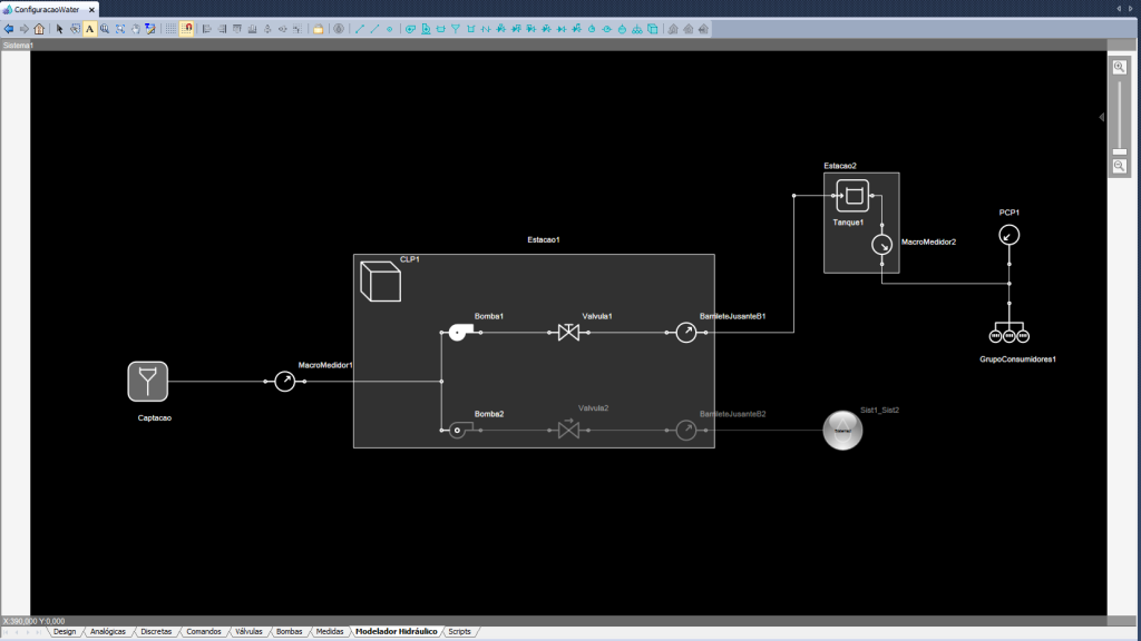 Com uma ferramenta gráfica destinada à modelagem de redes hidráulicas, o Elipse Water permite inserir e interligar elementos, como junções, tubulações, reservatórios, tanques, pontos de consumo, bombas, válvulas e definições de DMCs (Distritos de Medição e Controle). A partir deste modelo, a plataforma consegue identificar, de forma padronizada e contextualizada, as características, propriedades e modo como cada componente da rede está conectado e funcionando, permitindo gerar automaticamente telas esquemáticas simplificadas de operação.