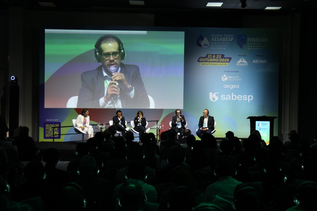 O 36º Encontro Técnico AESabesp e Fenasan 2025 dedicou sua programação, nesta quarta-feira, 22 de outubro, à uma das discussões mais fundamentais e urgentes do setor: “Após 5 anos do novo Marco Legal do Saneamento é possível universalizar até 2033?”, em mesa redonda coordenada e apresentada por Agostinho Geraldes, presidente da AESabesp. O debate contou com participação de Roberval Tavares de Souza, diretor de Engenharia da Sabesp, como moderador; e os palestrantes Samanta Souza, diretora de Relações Institucionais e Sustentabilidade da Sabesp; Carlos Almiro, diretor de Relações Institucionais, Sustentabilidade e Gestão de Riscos BRK Ambiental, Rogério de Paula Tavares, vice-presidente de Relações Institucionais da Aegea Saneamento; e Marilene Ramos, diretora de Relações Institucionais e Sustentabilidade do Grupo Águas do Brasil.