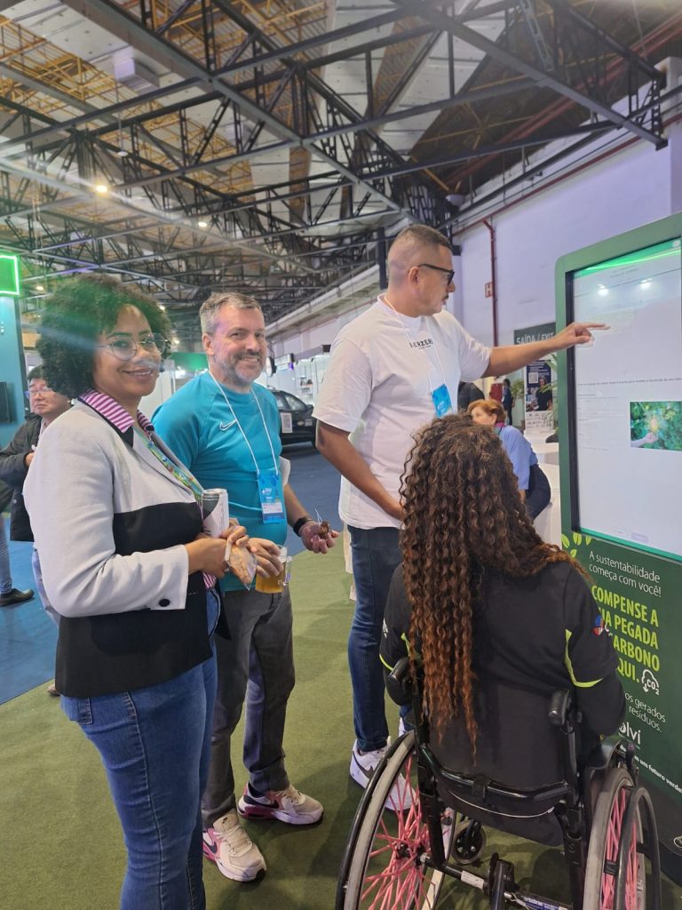 Novidade da parceria! Durante a Fenasan 2025, os visitantes puderam registrar sua pegada de carbono, para compensação das emissões pelo transporte utilizado e trajeto realizado (ida e volta) até o evento, no totem digital instalado na feira.