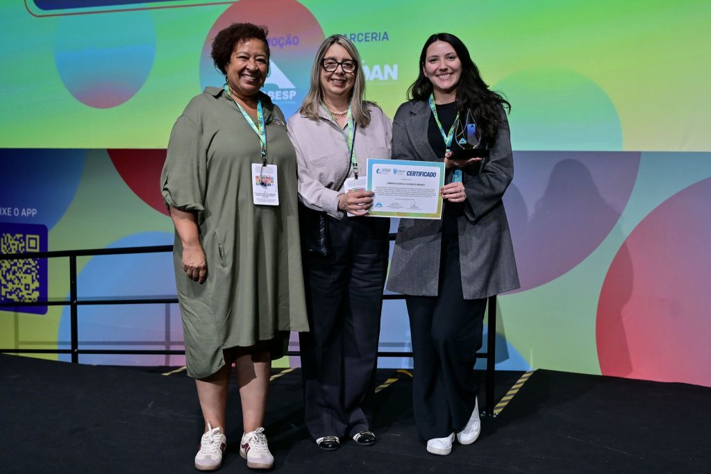 Os prêmios foram entregues por Lara Dias de Jesus, diretora de Polos da AESabesp, e Paulo Victor Vieira Sampaio, membro da Comissão Organizadora do evento.