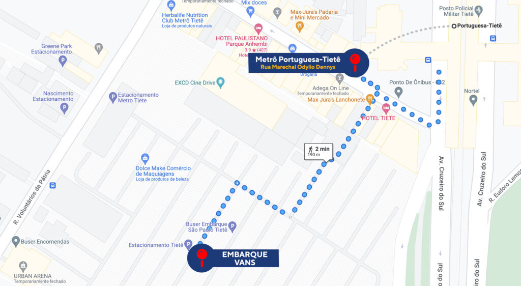 Ao desembarcar na estação Metro Tietê, sair pela Rua Marechal Odylio Denys, que fica na esquina com a Av. Cruzeiro do Sul, atravessar a rua e seguir até o número 138, onde localiza-se a entrada para o Estacionamento Unipare, de onde partirão as vans.
